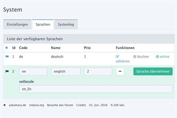 It is super easy to develop multilingual websites with REDAXO. Located at the System menu, you’ll find a section Languages, with german language predefined.
